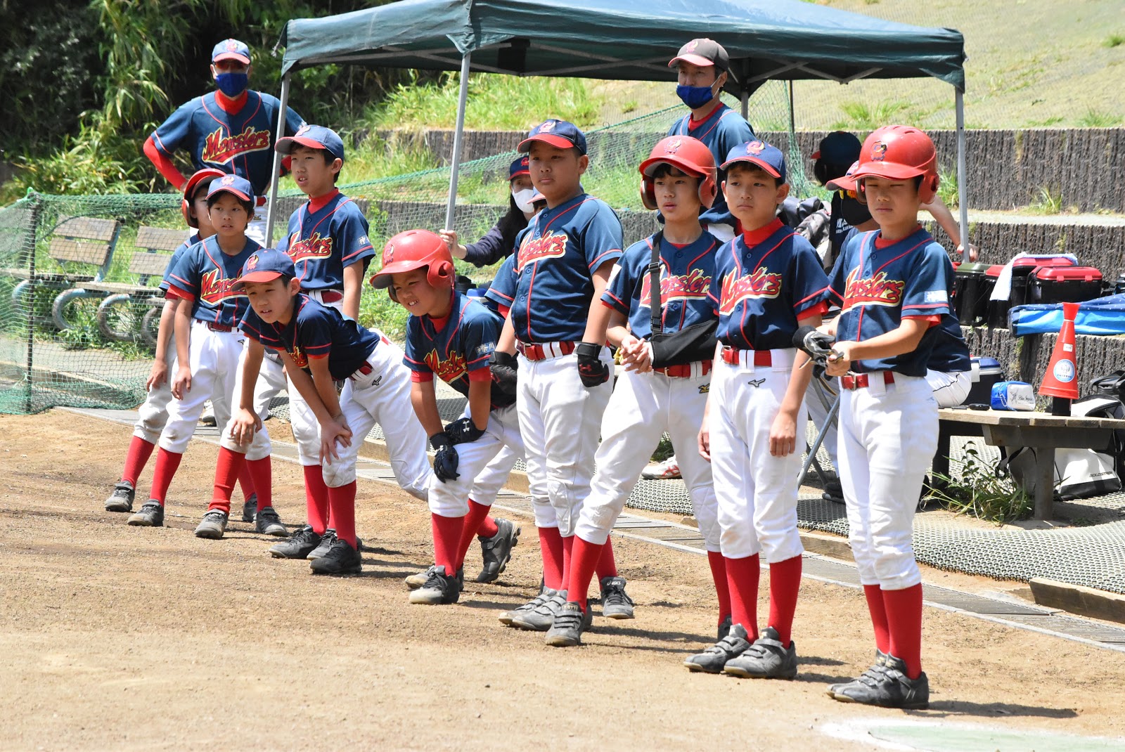 真ん中でメンをかぶるのは審判部事務局長Aokiさん。スーツを売っているわけではないので悪しからず。Aokiさんが披露しているのは少年野球審判の心意気である。