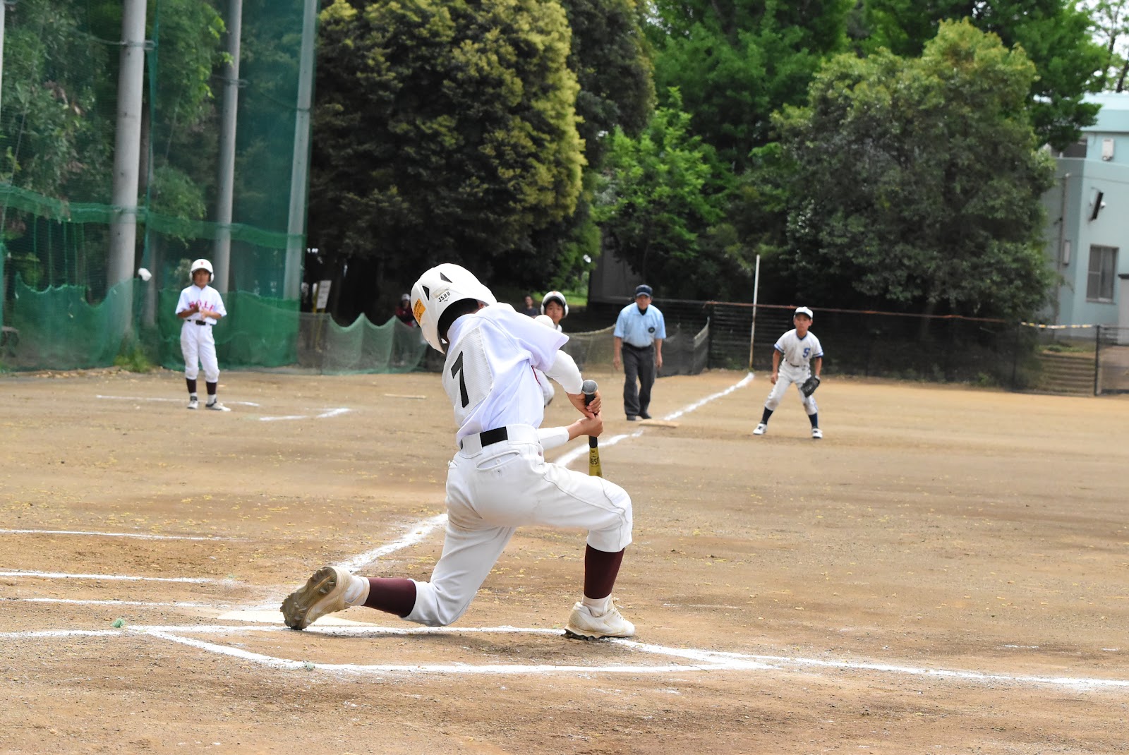 2回Wの攻撃時、筆者は木陰で白い煙の燃料補給をしていた時だった。バゴンと大音声(だいおんじょう)が球場に響くとボールはセンター奥の木立へ突き刺さった。慌てて現場へ戻りシャッターを切る。以前のブログで「宮前の大谷翔平」と称した彼が、爆速のソロホームランを放ったのだった。すぐさま連盟Tsujiさんからホームランボールを手渡され、ニンマリ顔の翔平くんであった。「俊足でなくてもゆっくり走って点が取れるのはホームランだぜ」との某コーチの助言が効いたのかもしれない。